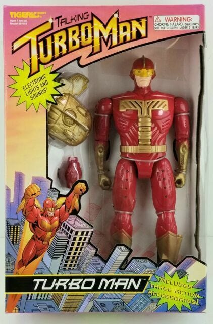It did do just that, though not on the scale one might expect: A real Turbo Man was made for toy stores that same year, a 13.5-inch figure from Tiger Electronics. Sealed versions currently run around $150-$300 on eBay, and they include his signature accessories, like the “Boomerang Shooter” and his “Rock ’n’ Roller Jet Pack.”